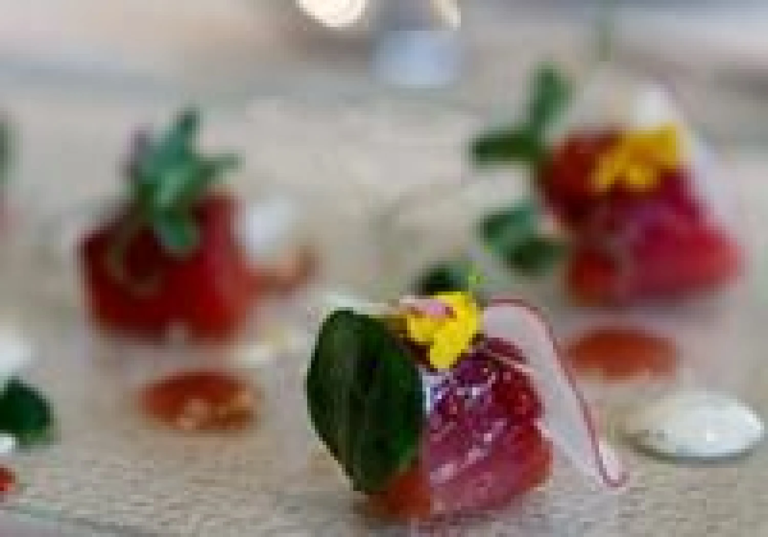 Dar vienas vykęs ir patiekalas, ir derinys, – marinuota laukinė lašiša iš Škotijos (marinuota lašiša, rabarbarai, krienai, mažųjų špinatų salotos, skrudinti lazdyno riešutai) su ispanišku vynu „Torres Fransola Sauvignon Blanc“, – ypač gerai čia suderėjo lašišos riebumas, rabarbarų džemas ir švelni, bet sykiu intensyvi vyno rūgštis. Virtuvės meistras paaiškina, kad norėdamas nudažyti lašišą raudonai marinuoja ją su burokėliais ir nesusilaiko nepriminęs, jog Škotijos aukštumų vanduo, kur tos lašišos veisiasi, yra vertinamas dėl grynumo, švarumo, minkštumo, todėl tinka aukštos kokybės viskiui gaminti.