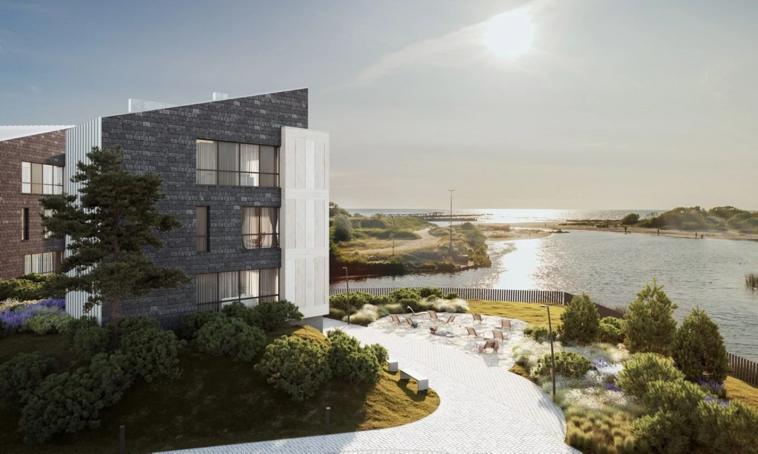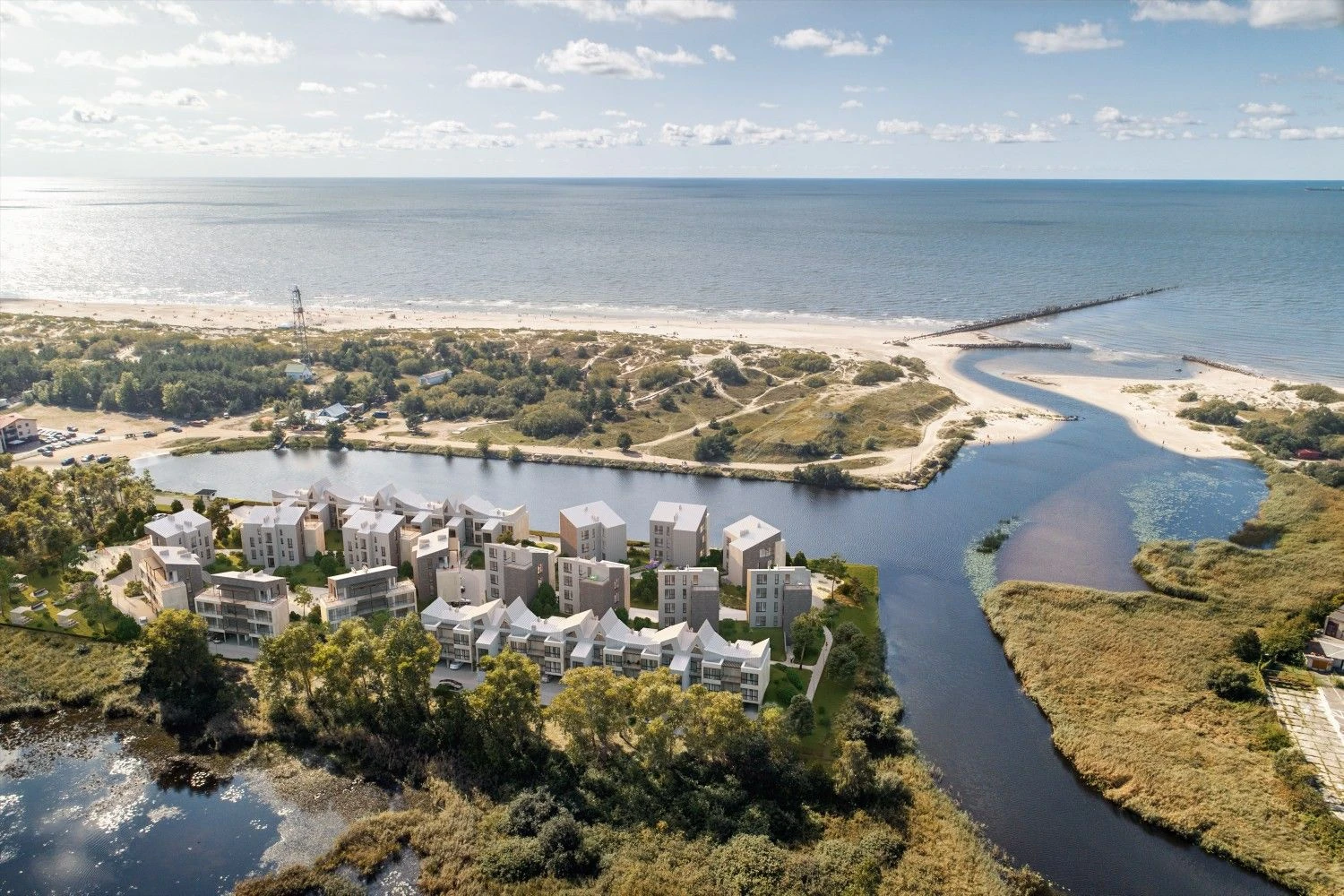 Pusiasalį iš trijų pusių supa Šventosios upės vandenys, iš kvartalo namų langų atsiveria raminančiai banguojanti Baltijos jūra, upės vingiai, smėlio kopos, iki kurių – vos keliasdešimt žingsnių. Tai arti jūros, prie pat vandens, plėtojami apartamentai Lietuvos pajūryje.