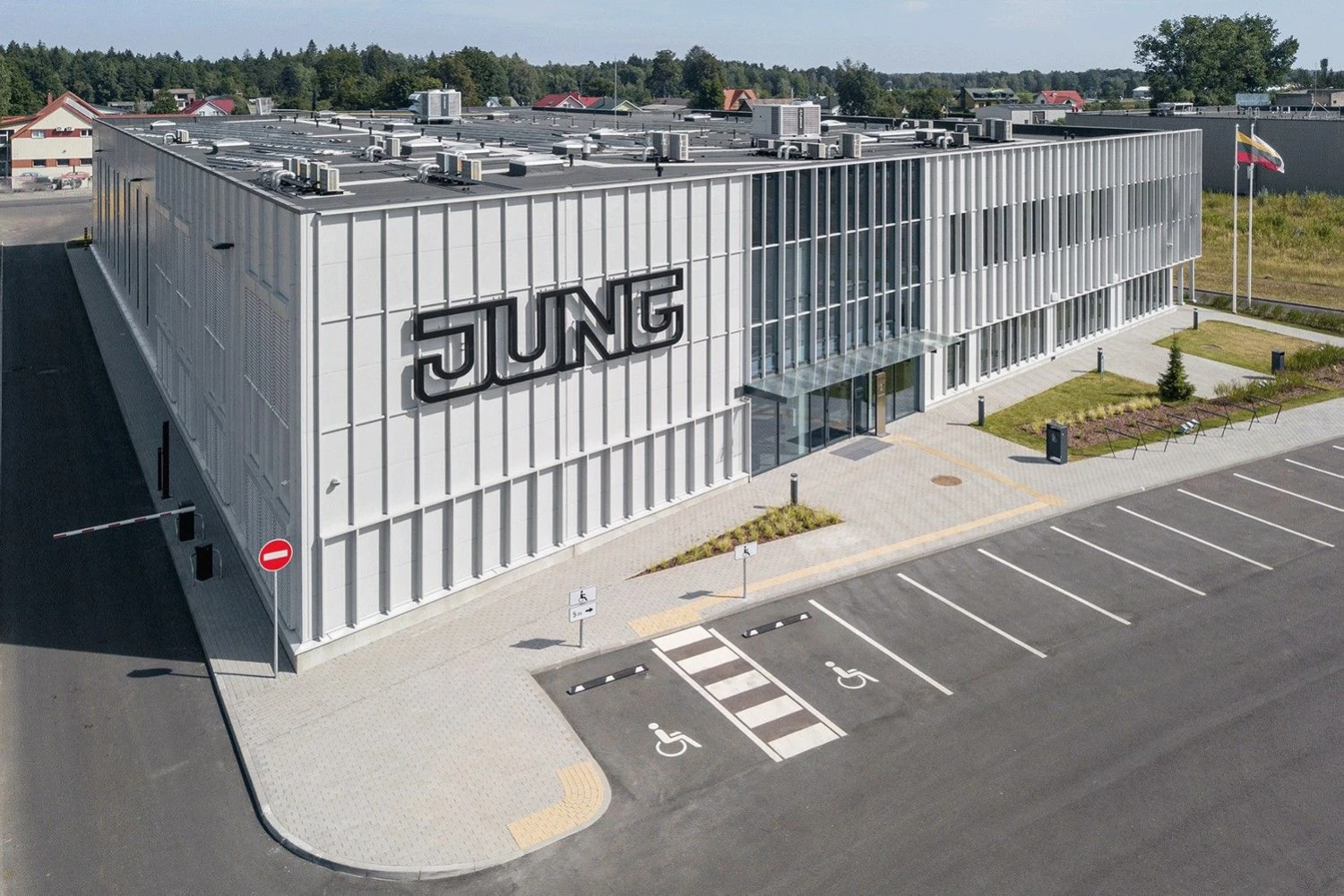 Naujasis „JUNG Vilnius“ biuras įrengtas Vilniaus pakraštyje, prie pat Ukmergės plento, Užubalių kaime. „Pasirinkti strategiškai gerą vietą buvo labai svarbu. Prie vienos svarbiausių automagistralių esantį biurą patogu pasiekti klientams, iš čia geras susisiekimas įvairiomis kryptimis, kas ypač svarbu dėl gaminių logistikos“, – privalumus dėstė „JUNG Vilnius“ vadovas.