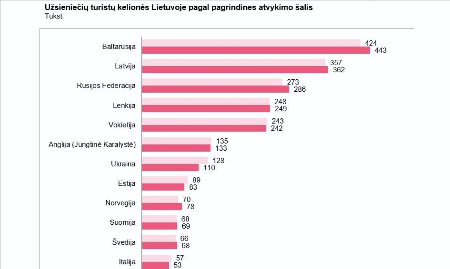 2019 m. dažniausiai vienadieniai lankytojai į Lietuvą atvyko iš kaimyninių šalių: Latvijos (1,1 mln., arba 35,1%), Baltarusijos (583.200, arba 17,8%), Lenkijos (605.100, arba 18,5%), Rusijos (492.600, arba 15%) ir Estijos (209.600, arba 6,4%).