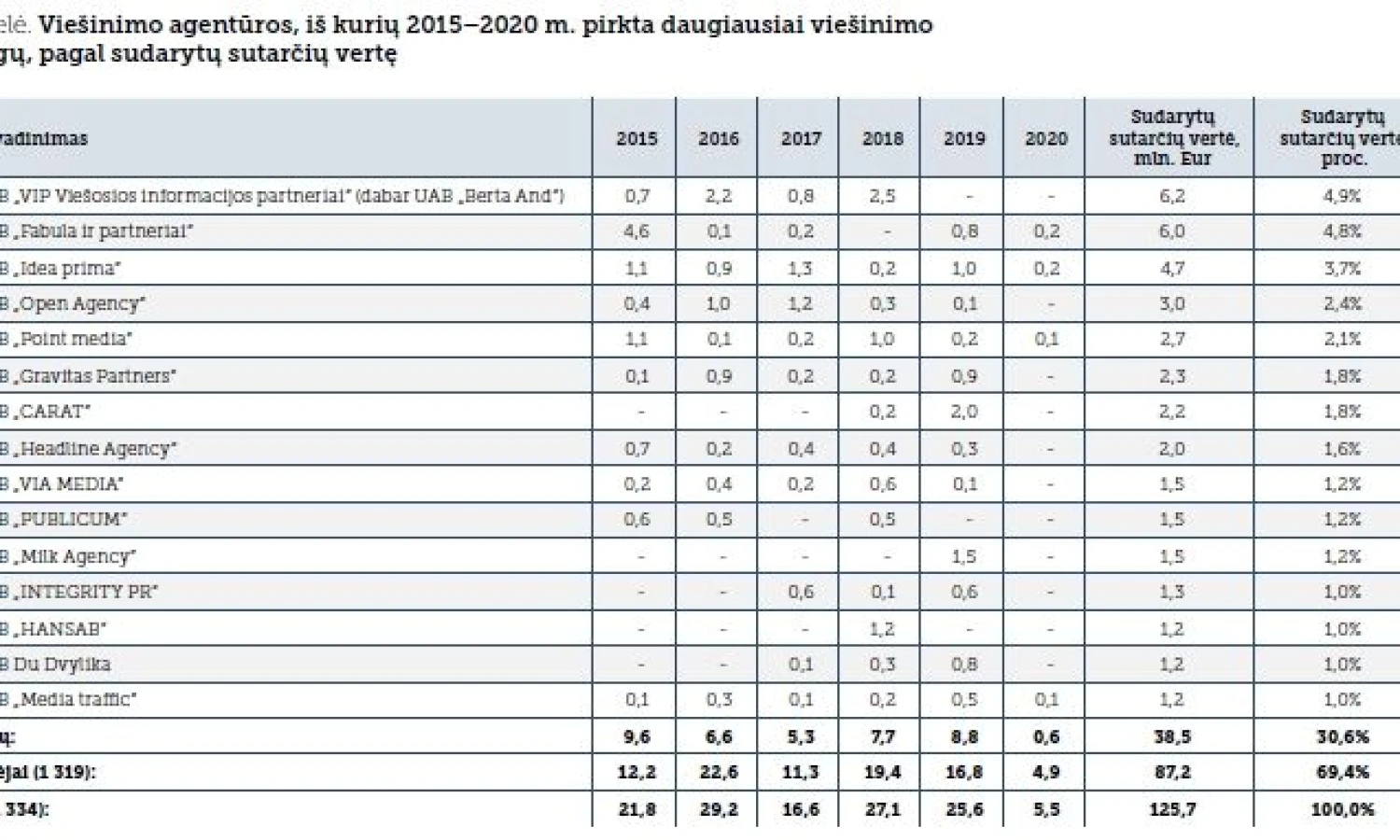 Tuometė agentūra „VIP Viešosios informacijos partneriai“ iki 2018 m. net 7 kartus buvo tarp trijų didžiausių pagal per metus sudarytų sutarčių vertę įmonių.