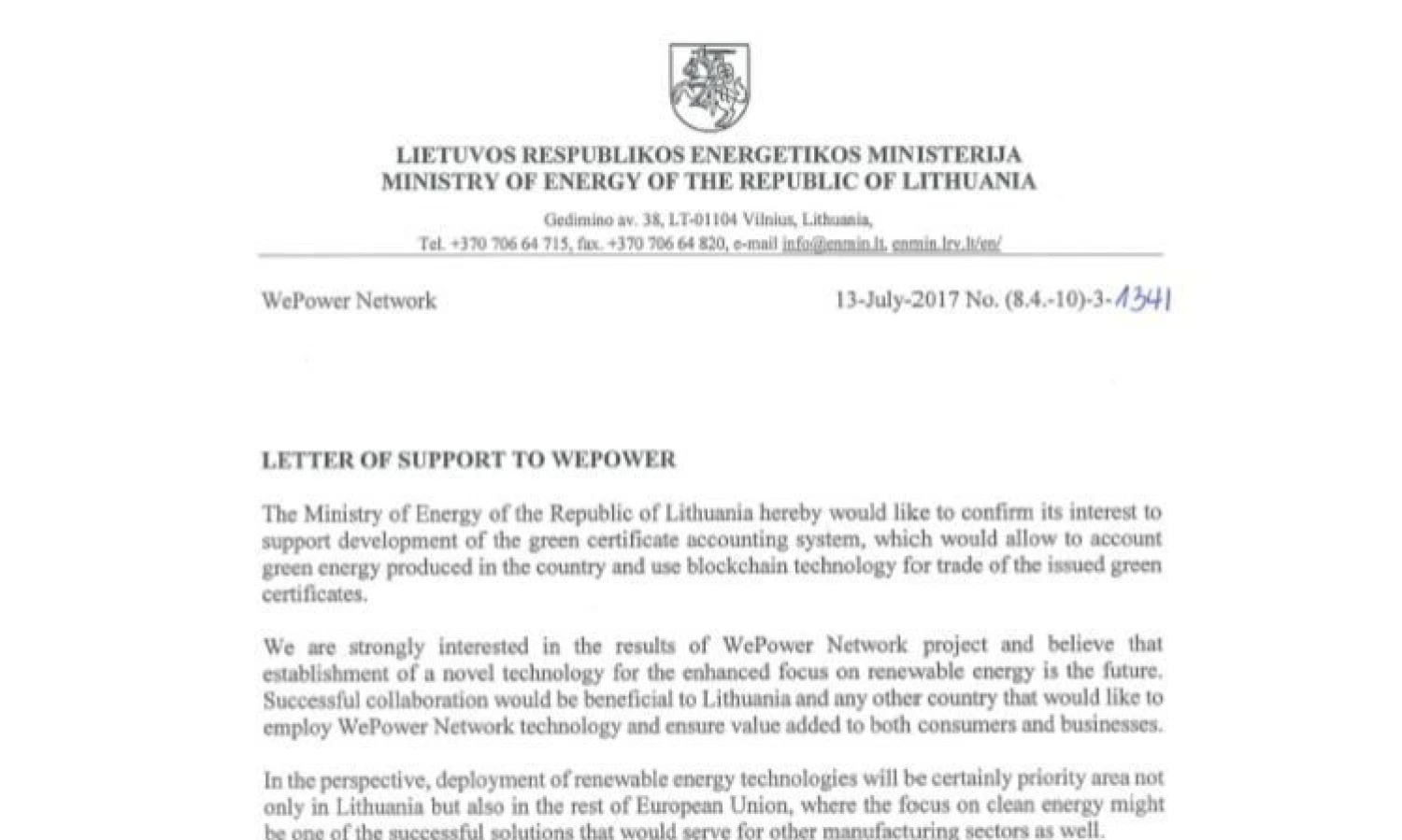 Nors Lietuvos bankas šiandien išsakė skeptišką poziciją kriptovaliutų ir ICO atžvilgiu, „WePower“ viešai skelbia energetikos ministro Žygimanto Vaičiūno raštą, kuriame ministerija išreiškia palaikymą „WePower“ projektui.