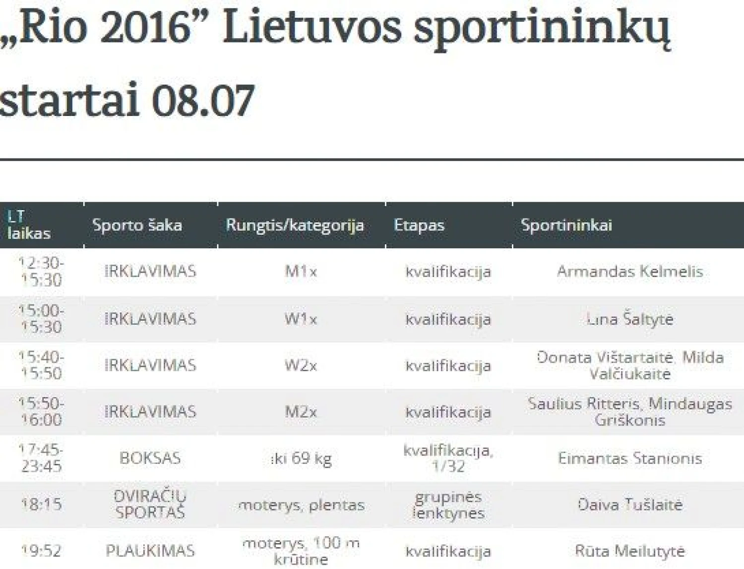 Sekmadienis „Rio 2016”: lietuvių sportininkų tvarkaraštis