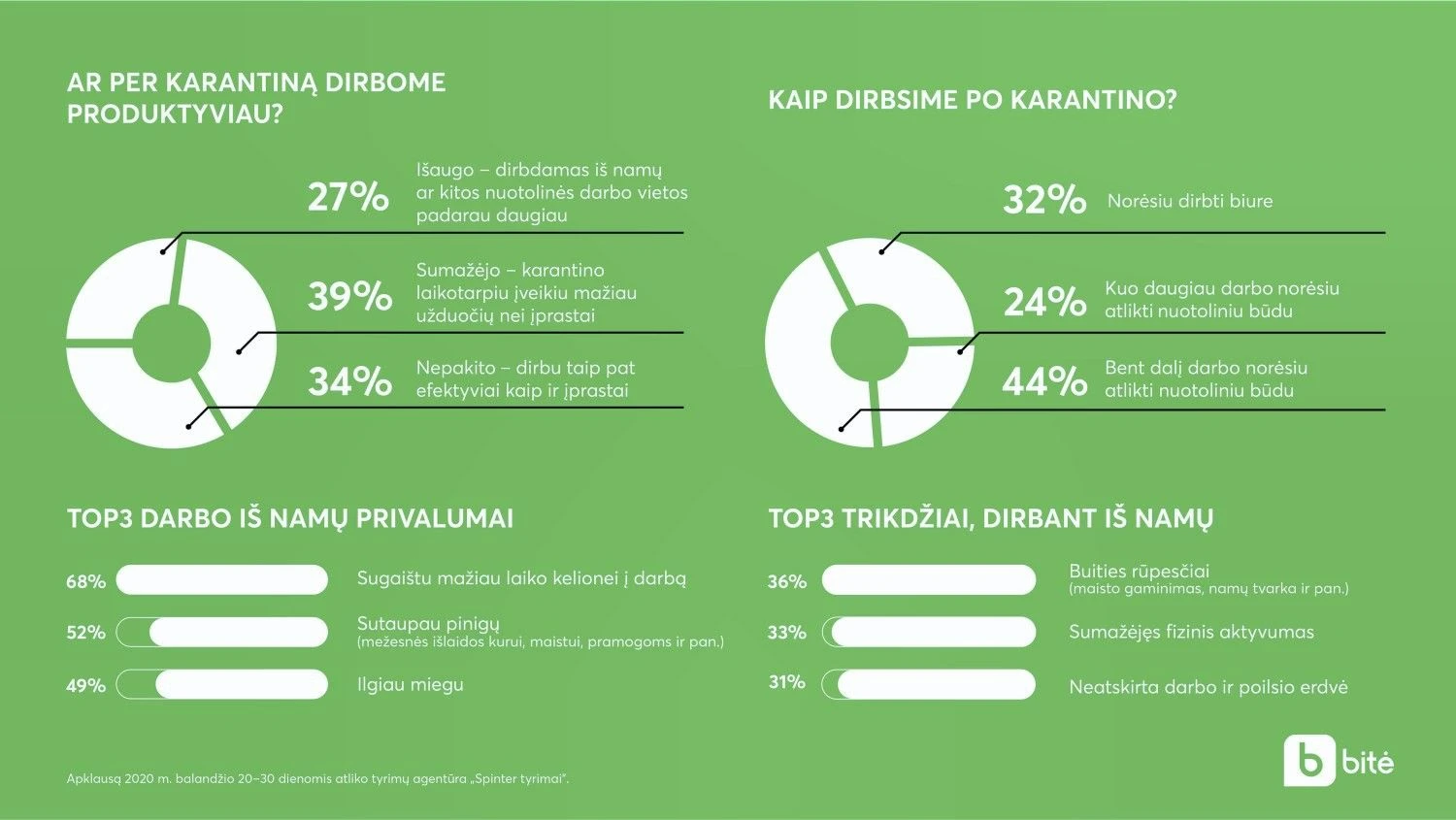 Apklausos metu taip pat paaiškėjo, kad nors džiaugiamės mažesnėmis išlaidomis, ilgesniu miegu, beveik kas antras, dirbantis iš namų, pastebi sumažėjusį produktyvumą. Siekiantys sužinoti, kaip su šiuo ir kitais karantino iššūkiais susitvarkyti lengviau, pasigenda darbdavių pagalbos – didesnio rūpesčio iš darbdavių šiuo laikotarpiu nesulaukė 38% apklaustųjų.
