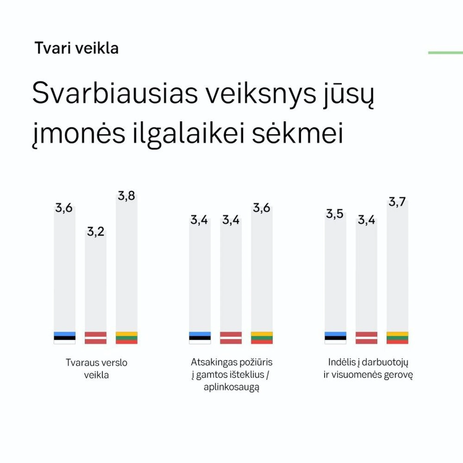 Daugiausiai svarbos – 3,8 balus iš 5 – lietuviškas verslas skyrė tvariai verslo veiklai, estai atitinkamai skyrė 3,6, o latviai – 3,2 balus. Tvari verslo veikla apima skaidrią tiekimo grandinę ir viešųjų pirkimų politiką, tvarų pardavimą ir konsultacijas bei vartotojų švietimą, skaidrią finansinę atskaitomybę ir pan. Indėlis į darbuotojų ir visuomenės gerovę lietuvių buvo įvertintas 3,7 balais, atsakingas požiūris į gamtos išteklius ir aplinkosaugą – 3,6 balais. Antri pagal pažiūras liko estai, o mažiausiai entuziazmo kiekvienai tvarumo sričiai parodė latviai. Nepaisant to, skirtumas tarp įverčių nėra didelis, ir kiekvienos šalies respondentų atsakymų vidurkis skalėje nuo 1 iki 5 įsiteko tarp 3,2 ir 3,8 balo.