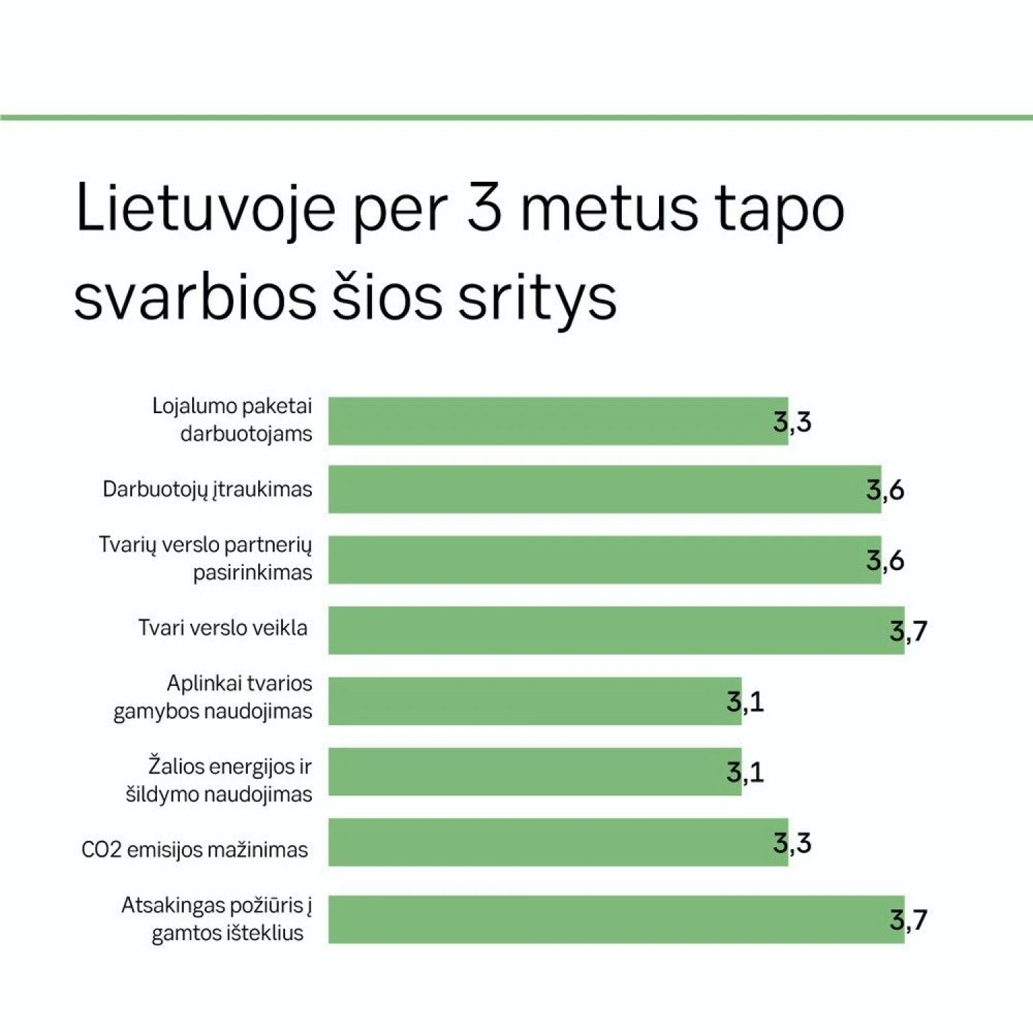 S. Gutauskaitė-Bubnelienė atkreipė dėmesį, kad verslo atstovai Baltijos šalyse pripažįsta, jog per pastaruosius trejus metų tvarumo temos jų įmonėse tapo itin svarbios. Apklaustieji Estijoje vidutiniškai net 4 iš galimų 5 balų įvertino pakitusią tvarios verslo veiklos reikšmę, nuo jų nedaug atsilieka ir respondentai iš Lietuvos – jie šios srities pokyčiui skyrė 3,7 balo. Lietuviai analogiškai įvertino ir padidėjusį atsakingą požiūrį į gamtos išteklius, o didesnį dėmesį tvarių partnerių paieškai įvertino 3,6 balais.