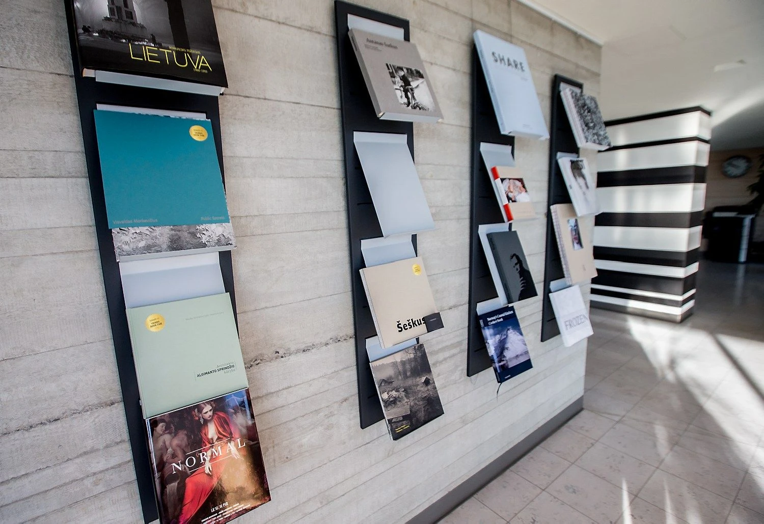 Paklaustas, o kas tai yra, vaikinas atsistoja ir iš pokalbių kambaryje esančios lentynos su spaustuvės darbų pavyzdžiais ima traukti įvairiais skirtingais būdais apipavidalintas knygas.