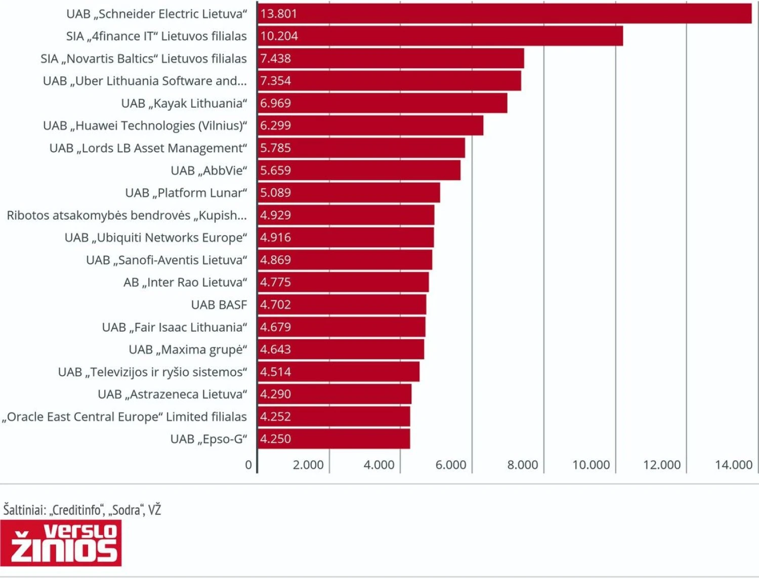 Antroje vietoje – „4finance IT“ Lietuvos filialas su 10.204 Eur prieš mokesčius. Trečioje – „Novartis Baltics“ Lietuvos filialas, kur algų mediana vasarį siekė 7.438 Eur prieš mokesčius.