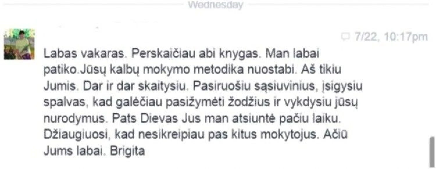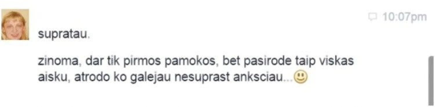 Bet mano sėkmė juk ne iš sėkmės atsirado. Aš ėjau į priekį, tada, kai eiti į priekį nemačiau prasmės. Mokais tuos anglų žodžius ir atrodo galo nėra. Atrodo jau išmokai pakankamai, paskaitai kokį rimtą psichologinį straipsnį, atrandi dar dvidešimt nežinomų anglų kalbos žodžių. Ką tada galvot? Tokia buvo mano realybė, todėl džiaugiuosi, kad tokių dalykų nereikia patirti mano mokiniams, nes jie gauna geriausius anglų kalbos kursus internetu.