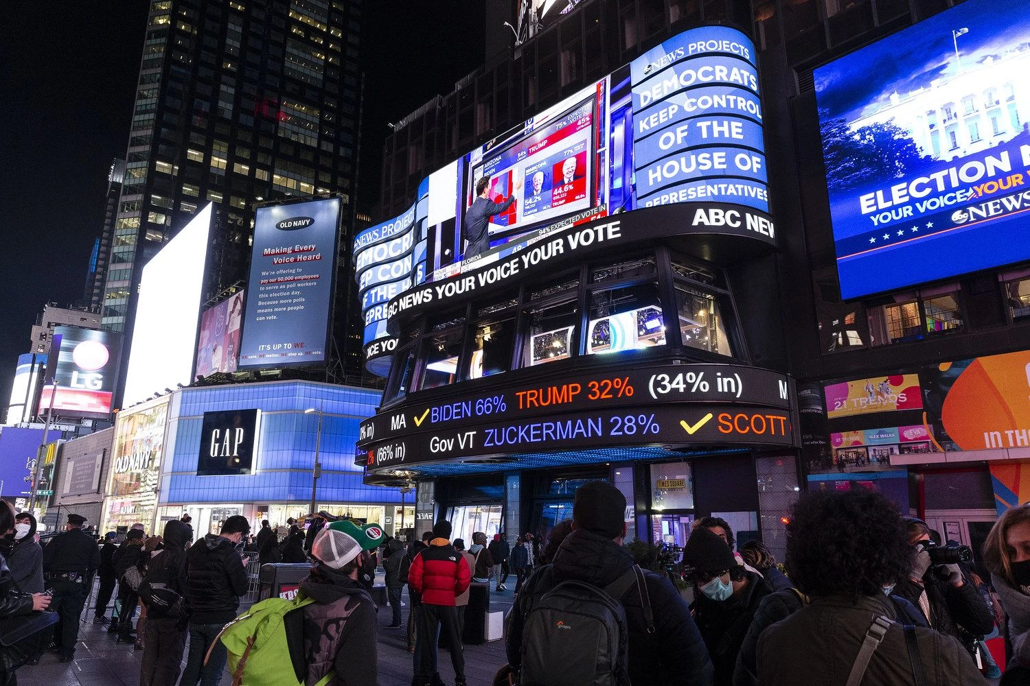 Kol kas demokratas J. Bidenas, remiantis AP rinkimų projekcijomis, surinko 223 rinkikų balsus, o D. Trumpas – 174. VŽ primena, kad pergalę JAV prezidento rinkimuose skelbia kandidatas surinkęs 270 rinkikų balsų.