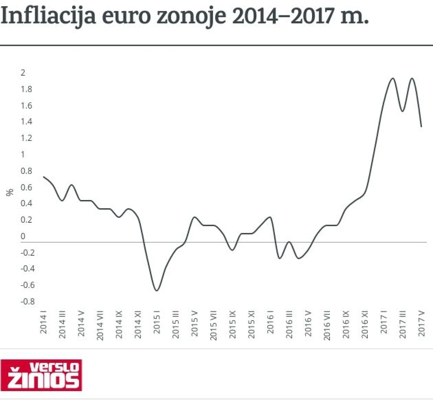 Bendrai ES ir euro zonoje metinė infliaciją gegužę kiek sulėtino apsukas, palyginti su balandžiu. Vis dėlto yra bene aukščiausiame taške per pastaruosius trekus metus. Euro zonoje metinė infliacija gegužę siekė 1,4%, visoje Bendrijoje – 1,6%, rodo duomenys. Tuo metu balandį rodikliai atitinkamai siekė 1,9% ir 2%.