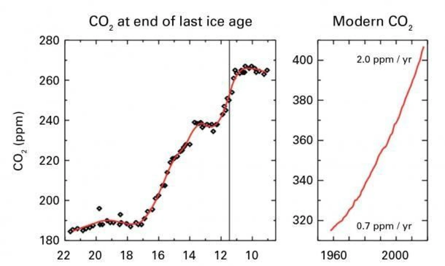 PMO pažymi, kad CO2 koncentracijos augimas per pastaruosius 70 metų yra beprecedentis – beveik 100 kartų spartesnis, nei baigiantis pastarajam ledynmečiui.