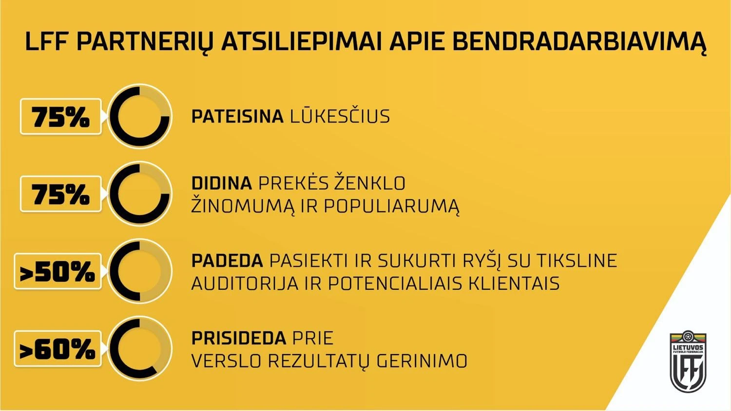 LFF rėmėjų ir partnerių apklausa atskleidė, jog net 75% bendrovių teigia, kad Lietuvos futbolo rėmimas tapo neatsiejama jų veiklos dalimi, o partnerystė su LFF atperka jų organizacijos lūkesčius.