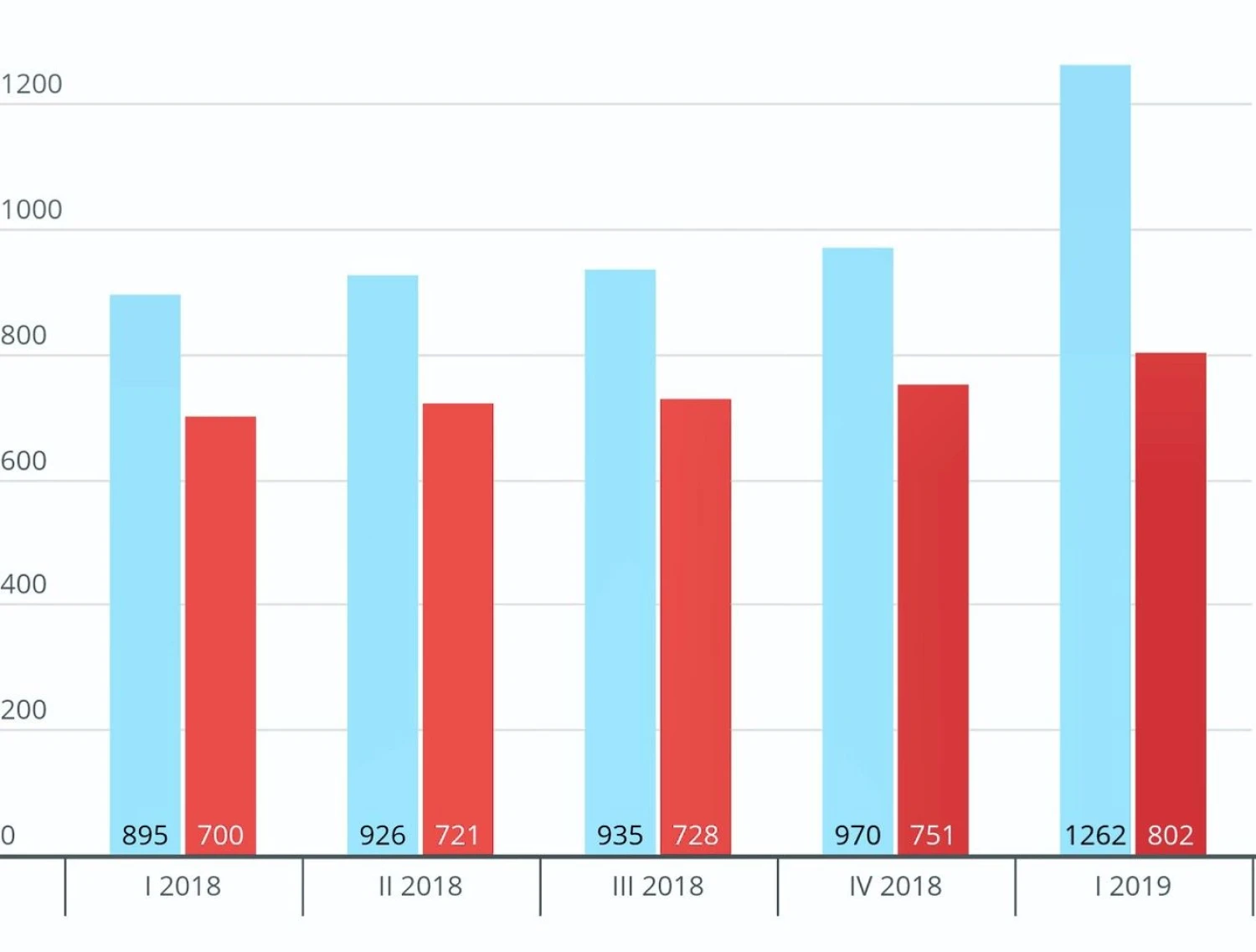 Šių metų pirmąjį ketvirtį vidutinė bruto alga pasiekė 1.262,7 Eur. Pernai tuo pačiu metu vidutinis bruto darbo užmokestis buvo 895,2 Eur.
